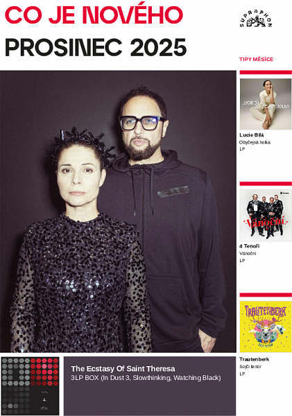 The Ecstasy Of Saint Theresa3LP BOX (In Dust 3, Slowthinking, Watching Black)Speciální 3LP BOX The Ecstasy Of Saint Theresa v limitované sérii V loňském roce 2024 se splnil velký sen fanoušků legendární skupiny The Ecstasy Of Saint Theresa, když se po více než jedné dekádě Jan P. Muchow s Kateřinou Winterovou vrátili na koncertní pódia. Letos navíc přidali po devatenácti letech novou nahrávku v podobě singlu Moon Sun Anything, doprovázenou mimořádně vizuálně zajímavým videoklipem. Nyní vychází vůbec poprvé na vinylu speciální limitovaný box tří alb vydaných v rozmezí let 1999 až 2006. Jedná se o alba In Dust 3 (1999), Slowthinking (2002) a Watching Black (2006), tedy období, kdy „Extázi“ reprezentuje základní duo – multiinstrumentalista a producent Jan P. Muchow a zpěvačka a herečka Národního divadla Kateřina Winterová. Všechna alba měla ve své době mimořádný ohlas, definovala vždy aktuální trendy žánru a získávala pravidelně prestižní výroční hudební ceny. Pro toto vydání připravil grafik a designer Pavel Fuksa nejenom speciální formát 3LP, ale i novou grafickou úpravu. Ta sjednocuje všechny desky do jednoho vizuálního celku, vždy však s originálním odkazem na původní grafiku. Nahrávky prošly pečlivým vinyl masteringem, který ocení zvláště příznivci tradičně precizního zvuku kapely. Celý box vychází v limitované číslované sérii 500 ks jako 180g vinyl. LP1 Just A Fade / Neon / Winter 22 / Dumb It / Go!!! / Noises Of Silence / Ikarie XB1 / Hunted By Demons / 1+1=11 3LP 180 g ![]() SU 6975-1